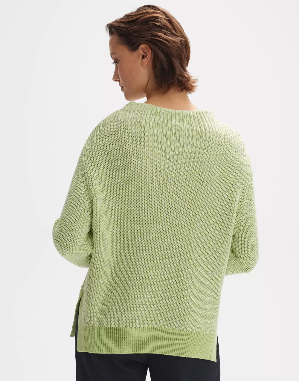 De Gebreide Trui Creeert Een Dynamische Gemeleerde Look Dankzij Het Mouline-Effect. De Effen Manchetten Zorgen Voor Een Mooi Contrast.