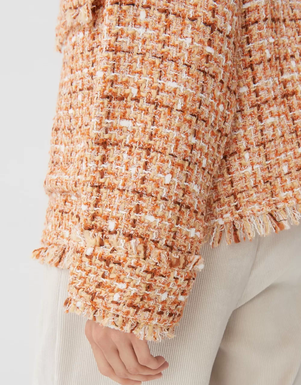 Het Blazerjasje In Klassieke Chanel-Look Krijgt Een Dynamisch Oppervlak Door De Bouclestof. De Randen Met Franjes Aan De Zomen En De Grote Klepzakken Zorgen Voor Een Moderne Update.