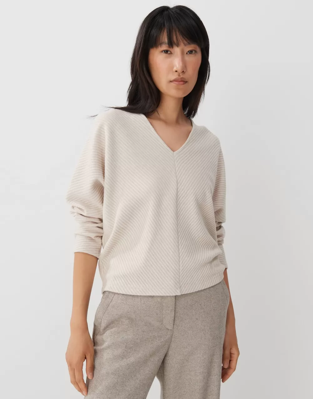 De Trui Is Gemaakt Van Een Aangename Viscosemix En Leeft Van Een Dynamische Ottomaanstructuur Die Over Een Moderne O-Vorm Wordt Gespeeld. De V-Halslijn Voegt Een Vrouwelijke Touch Toe.
